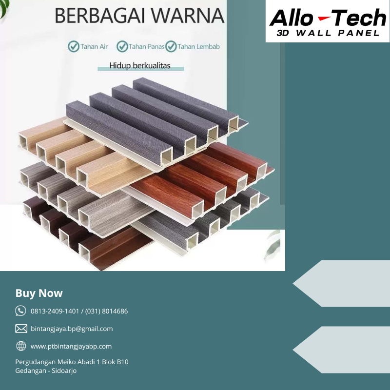 WallPanel WPC Allo-Tech adalah material komposit yang terbuat dari campuran serat kayu dan bahan polimer. Campuran ini menghasilkan produk akhir yang menawarkan estetika kayu alami sambil mempertahankan daya tahan dan ketahanan terhadap cuaca. Wall Panel WPC Allo-Tech digunakan untuk menghias dinding dalam ruangan, menciptakan tampilan yang indah dan tahan lama.